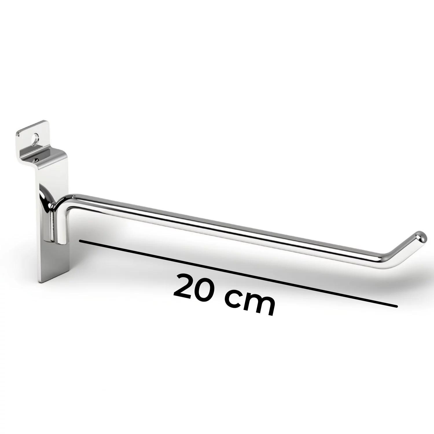 Agățător metalic pentru panouri slatwall, cu grosime de 6 mm și lungime de 20 cm, ideal pentru susținerea sigură și expunerea clară a produselor în magazin. Construcția solidă oferă durabilitate, iar lungimea permite afișarea mai multor articole pe același cârlig.