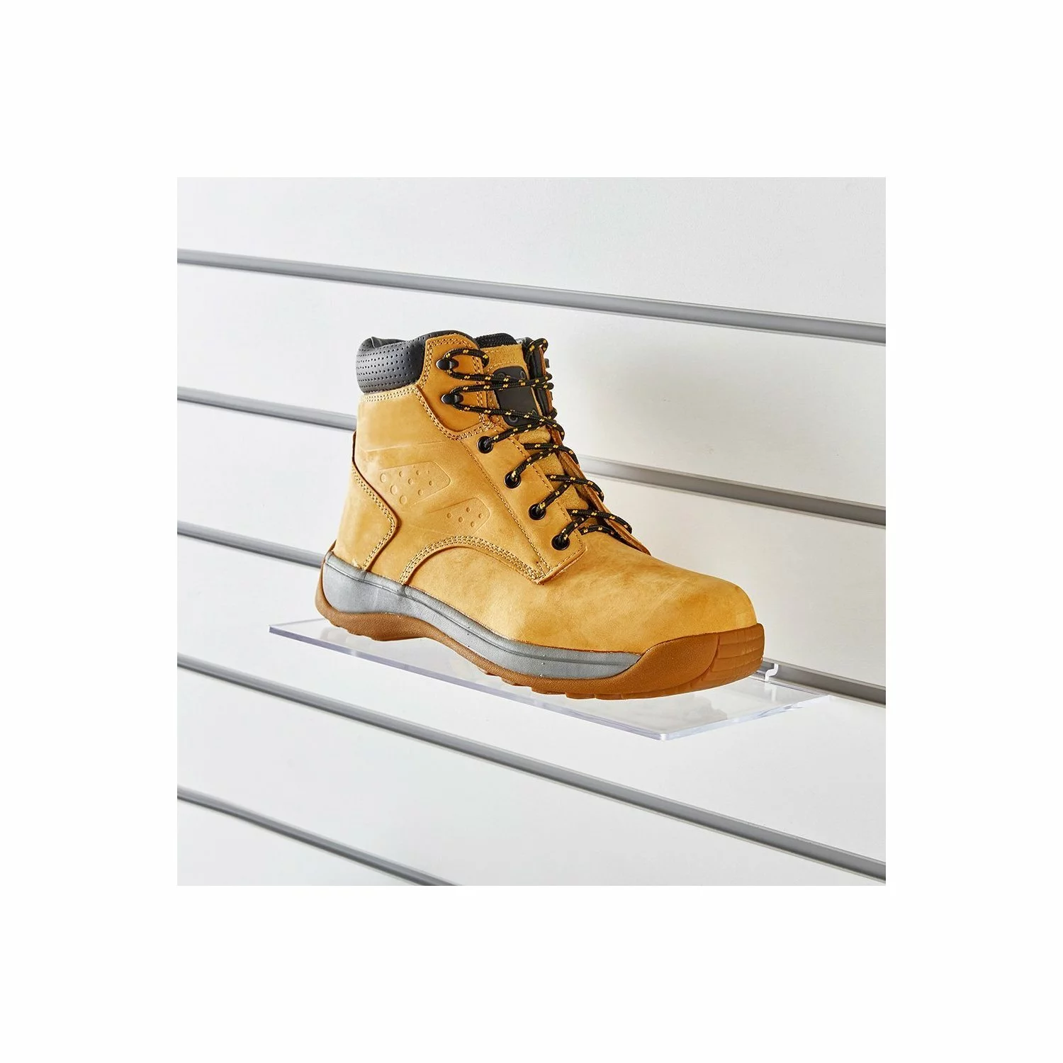 Suport pentru incaltaminte din plexiglas transparent, cu fixare pe panoul slatwall.