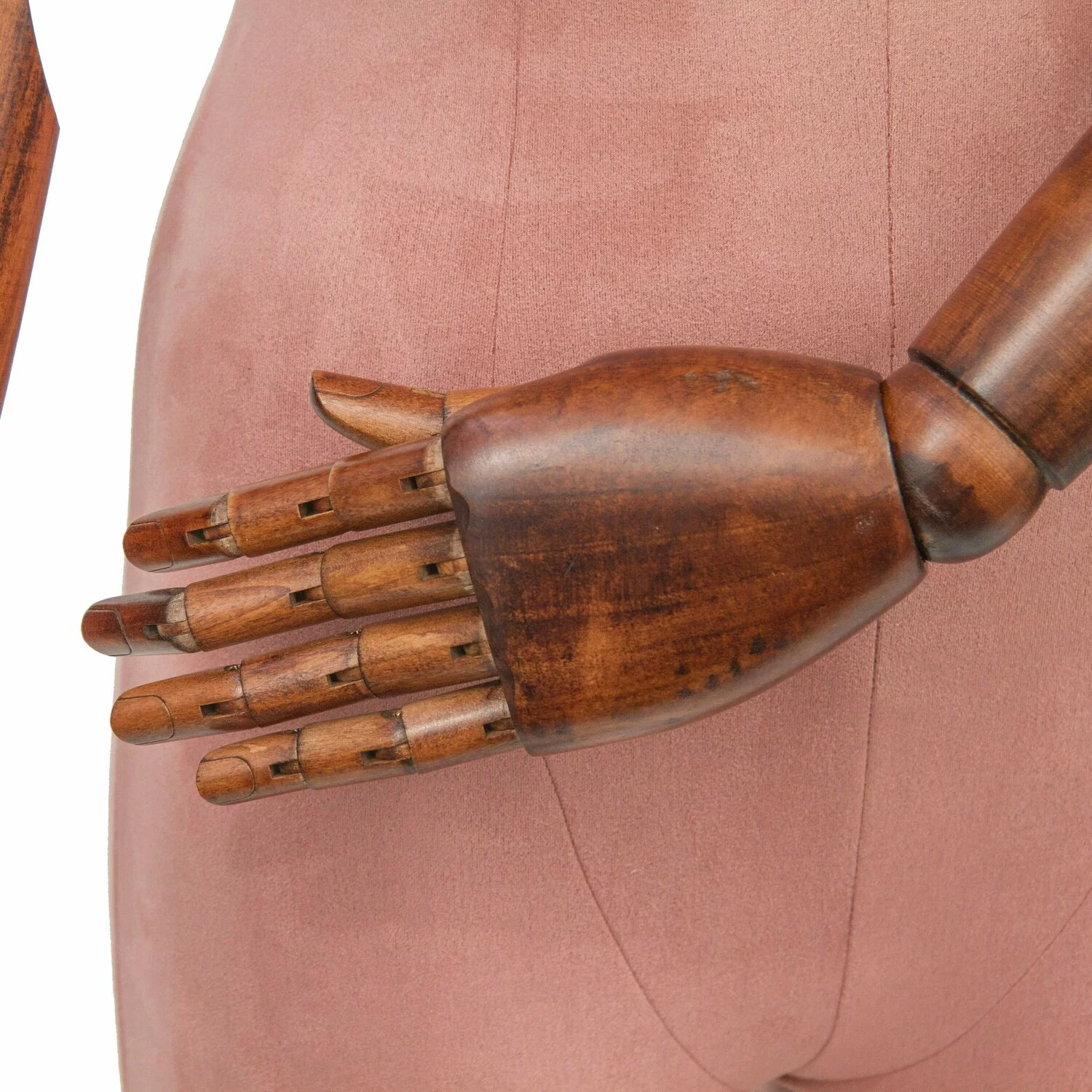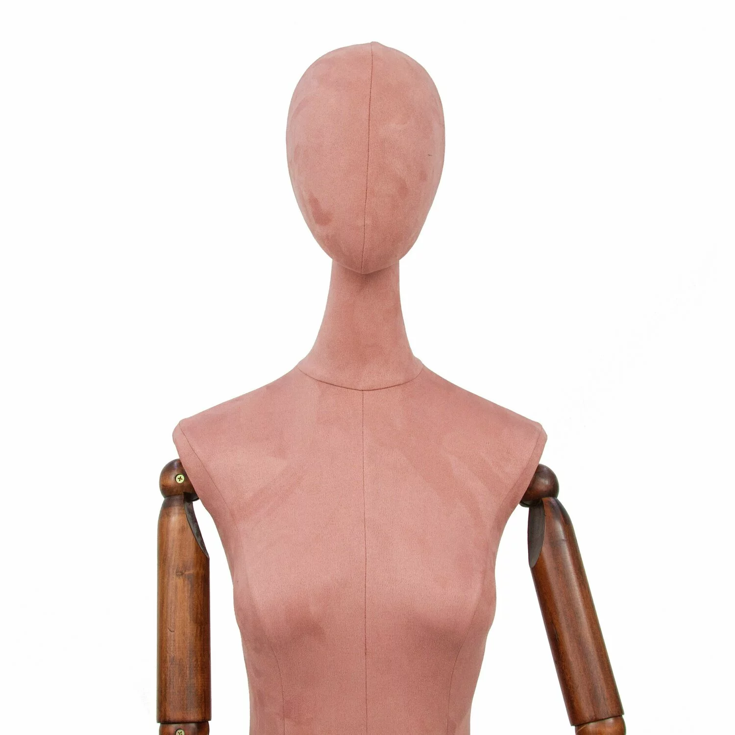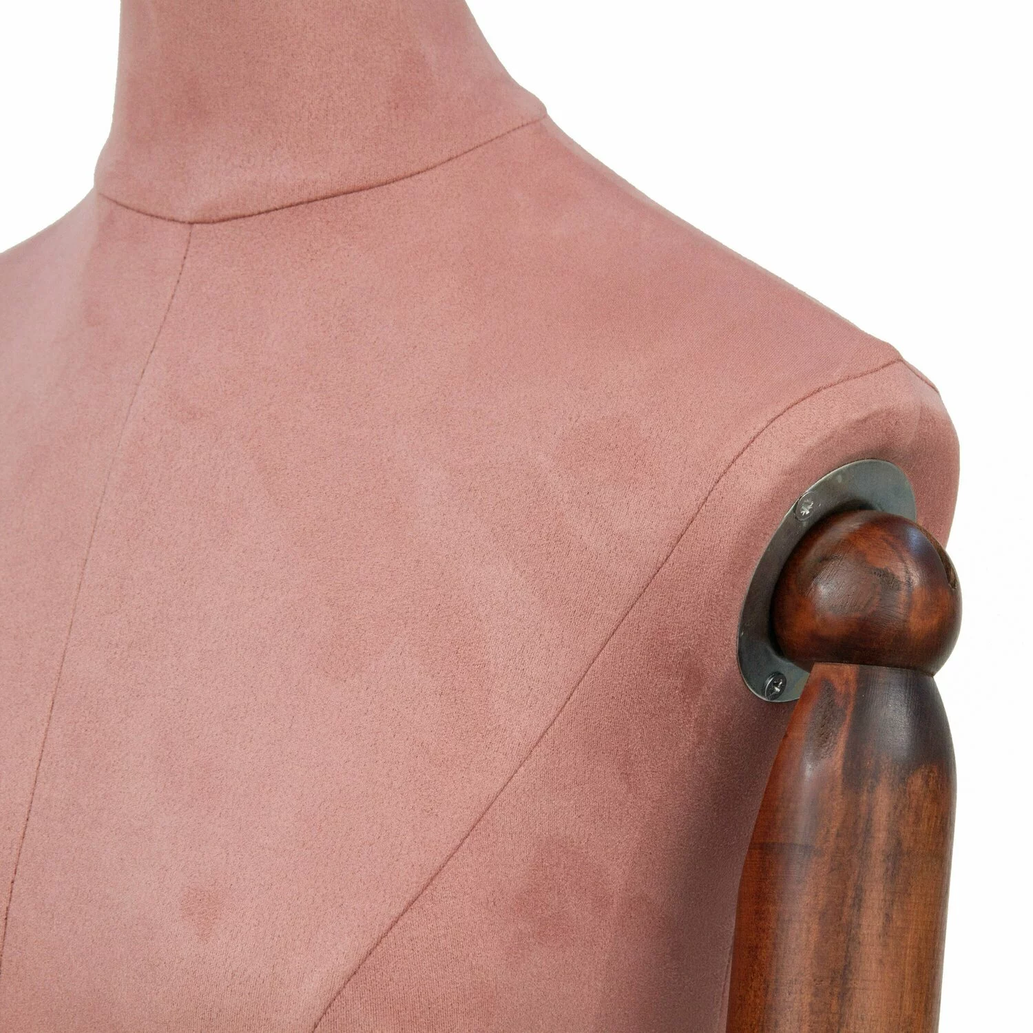 Manechinul este acoperit cu un material catifelat de culoare roz inchis.