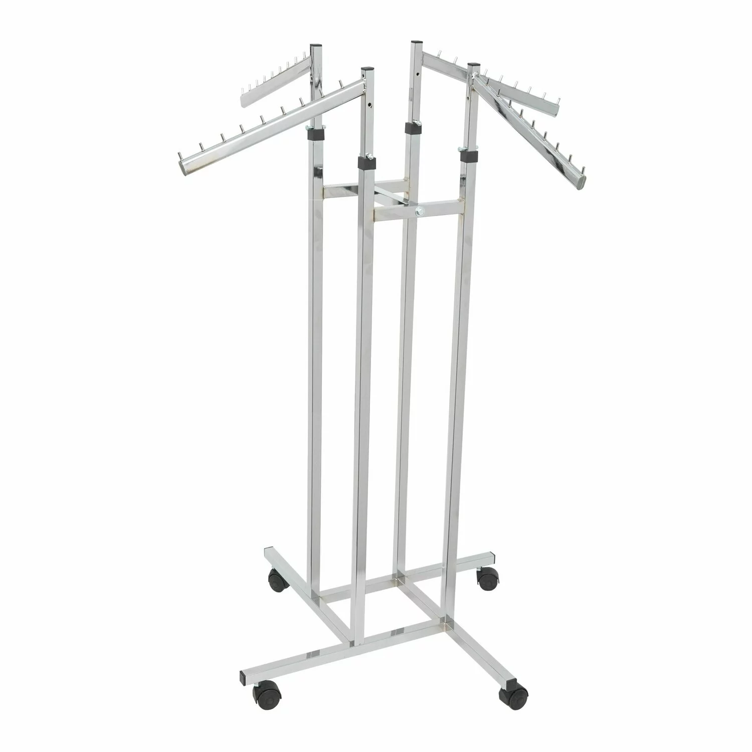 Acest model de suport pentru haine are patru brate reglabile care ofera un spatiu de expunere generos, cele patru brate cu inaltimea reglabila de la 150 la 180 cm permit untilizarea lui pentru o gama variata de aricole. Dotarea standard vine cu roti din metalice foarte rezistente care ajuta la mobilitatea stenderului.