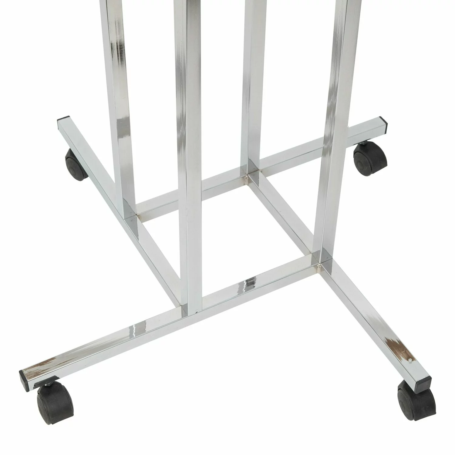 Stender din metal cromat, cu patru brate pentru umerase reglabile pe inaltime cu roti metalice