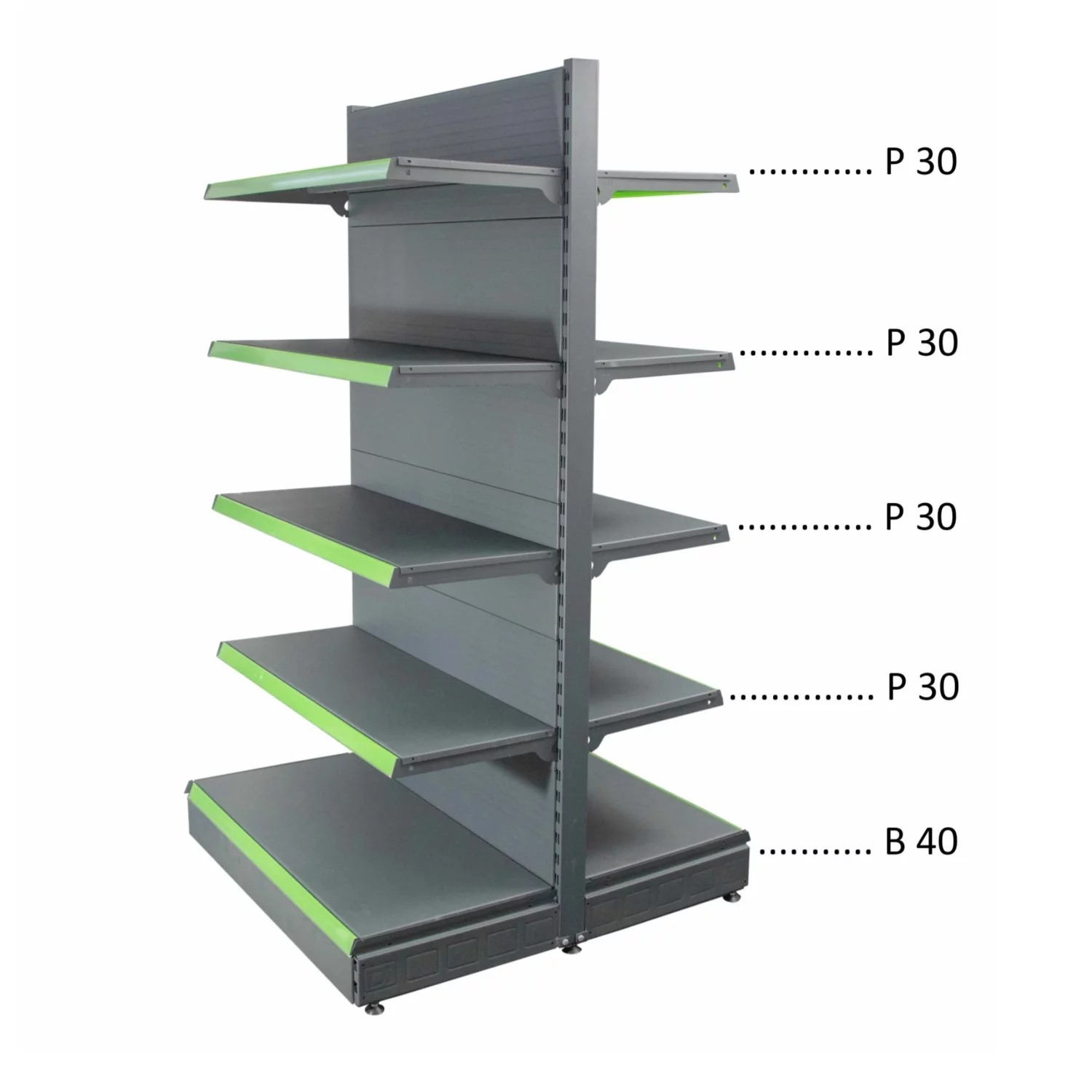 1 x montant, 12 x spate plin, 2 x 40 cm baza, 8 x 30 cm polita cu console si suport etichete, 2 x masca, 1 x capac gondola (Important: Acest raft include 1 montant (2 sunt prezentate în imagine), pentru a permite conectarea mai multor unități. Pentru a finaliza tronsonul de rafturi trebuie să fie cumpărat un montant final) |