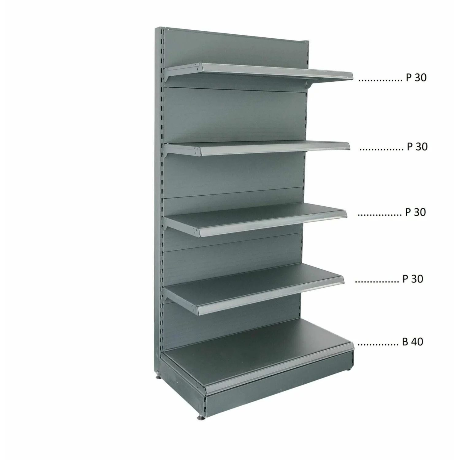 1 x montant, 6 x spate plin, 1 x 40 cm baza, 4 x 30 cm polite cu console si suport etichete, 1 x masca (Important: Acest raft include 1 montant (2 sunt prezentate în imagine), pentru a permite conectarea mai multor unități. Pentru a finaliza tronsonul de rafturi trebuie să fie cumpărat un montant final) |