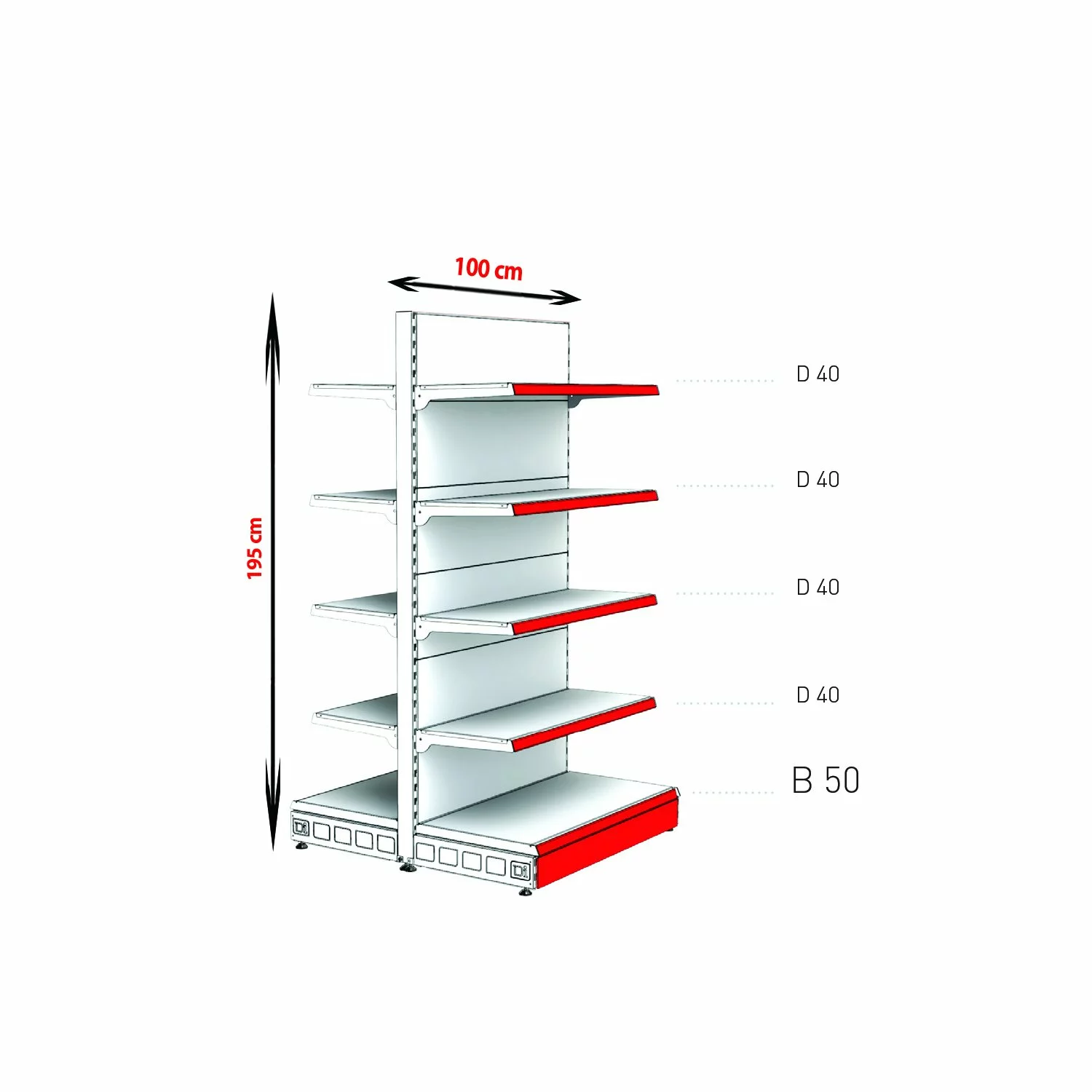 1 x montant, 12 x spate plin, 2 x 50 cm baza, 8 x 40 cm polita cu console si suport etichete, 2 x masca (Important: Acest raft include 1 montant (2 sunt prezentate în imagine), pentru a permite conectarea mai multor unități. Pentru a finaliza tronsonul de rafturi trebuie să fie cumpărat un montant final) |