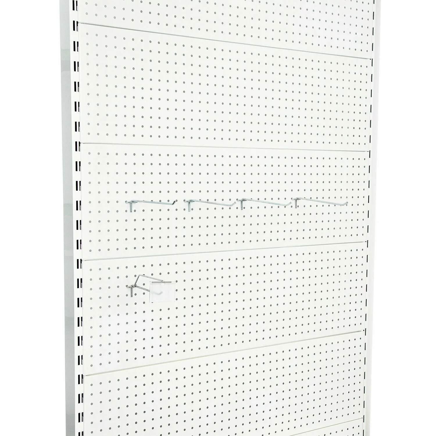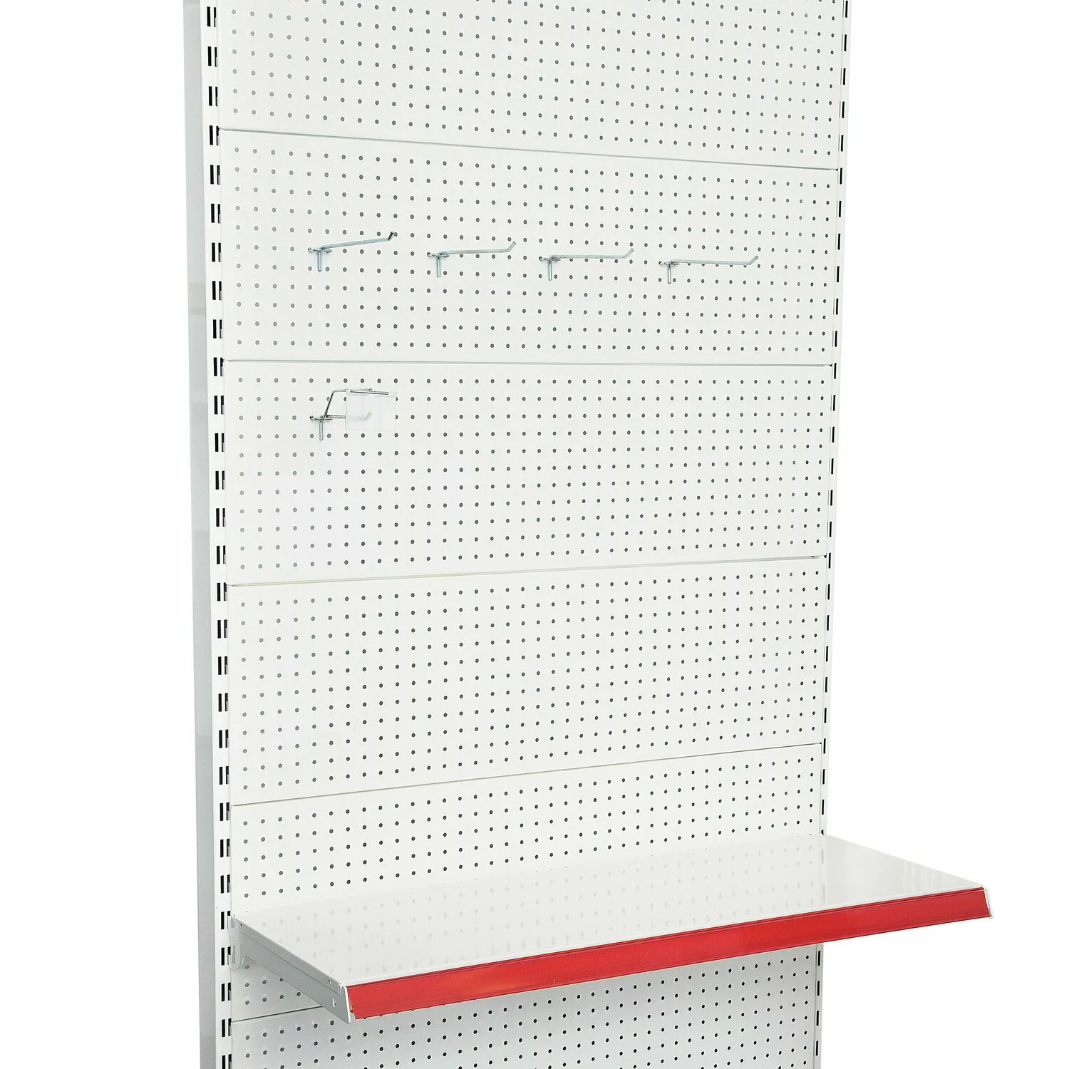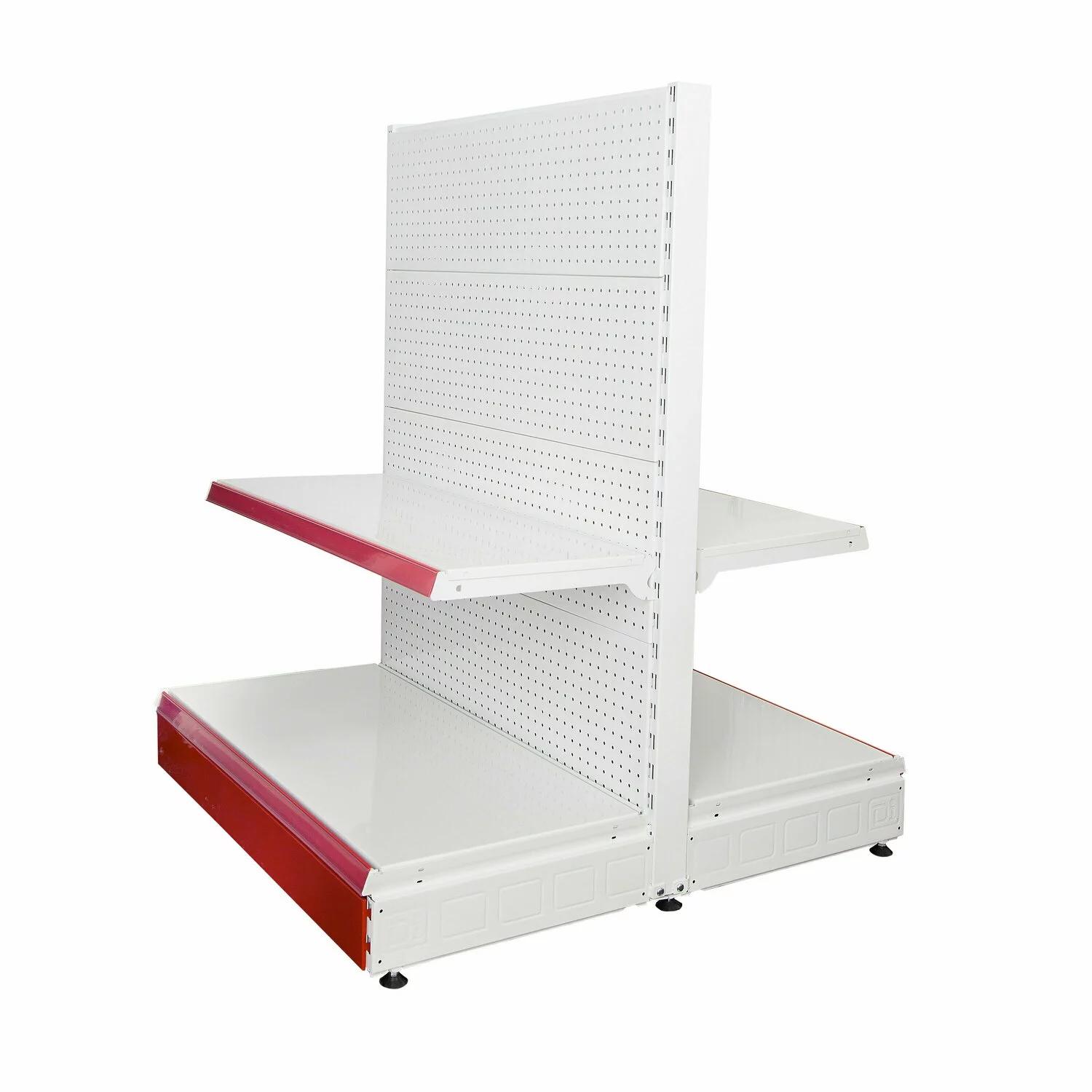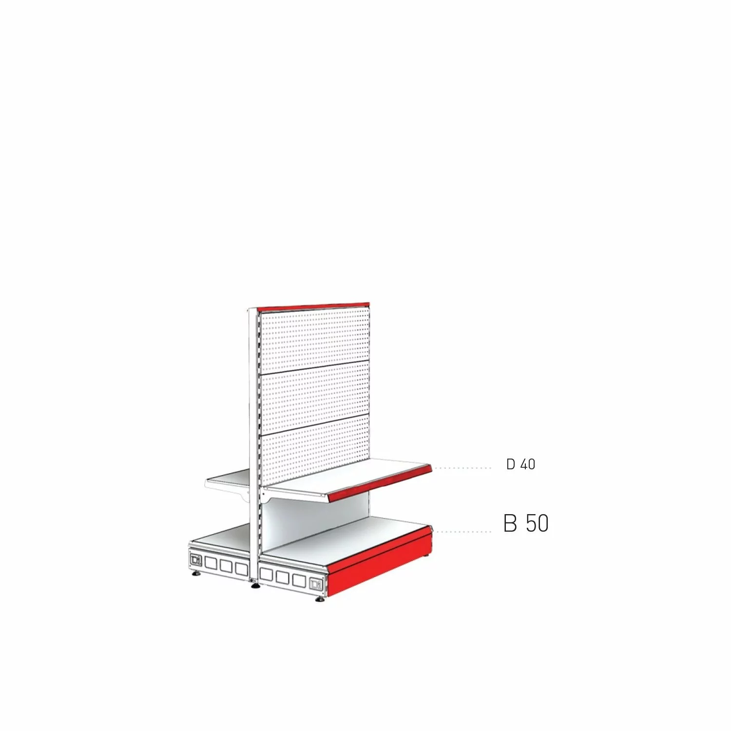 1 x montant, 8 x spate perforat, 2 x 50 cm baza, 2 x 40 cm polita cu console si suport etichete, 1 x masca, 1 x capac gondola (Important: Acest raft include 1 montant (2 sunt prezentate în imagine), pentru a permite conectarea mai multor unități. Pentru a finaliza tronsonul de rafturi trebuie să fie cumpărat inca un picior montant final) |