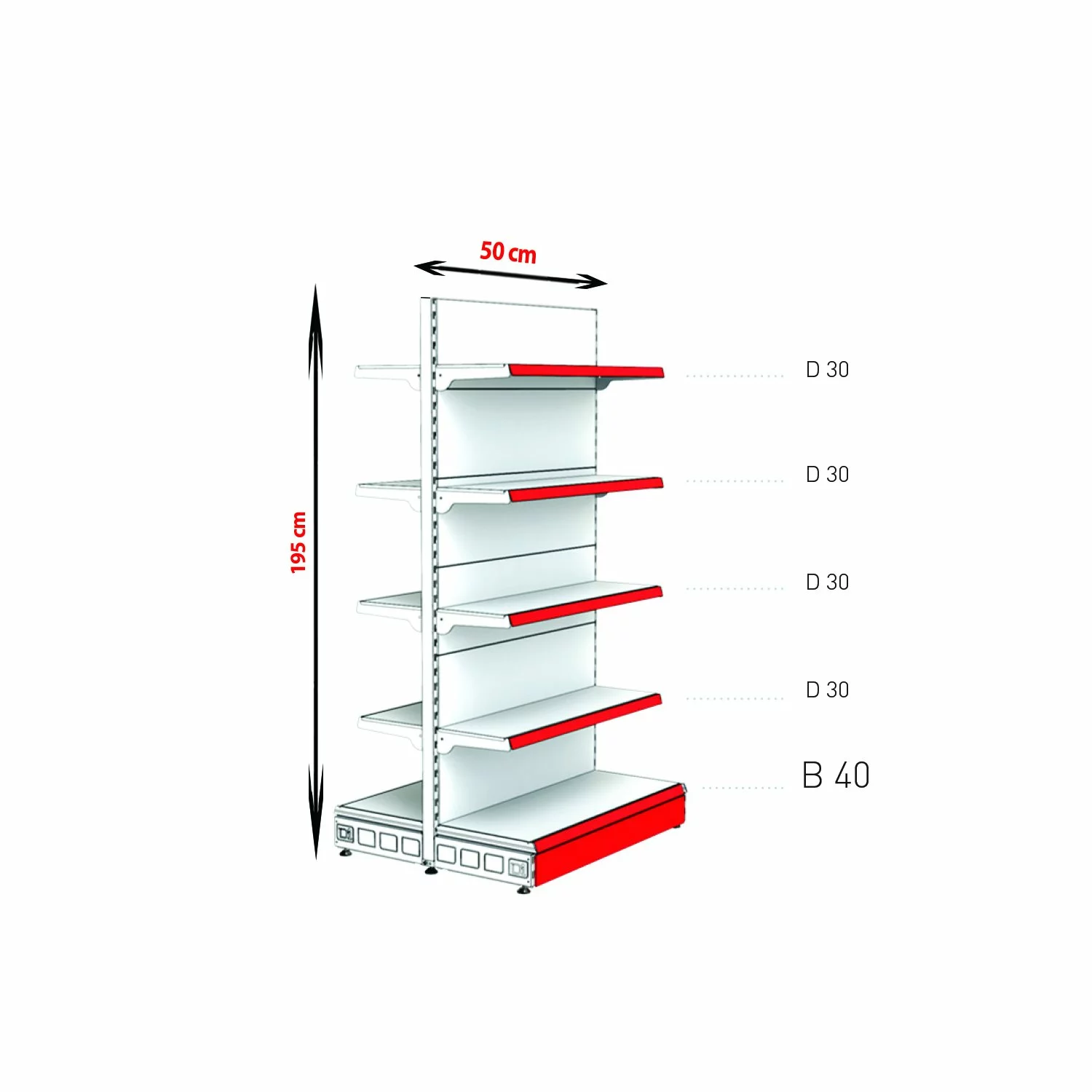 1 x montant, 12 x spate plin, 2 x 40 cm baza, 8 x 30 cm polita cu console si suport etichete, 2 x masca, 1 x capac gondola (Important: Acest raft include 1 montant (2 sunt prezentate în imagine), pentru a permite conectarea mai multor unități. Pentru a finaliza tronsonul de rafturi trebuie să fie cumpărat un montant final) |