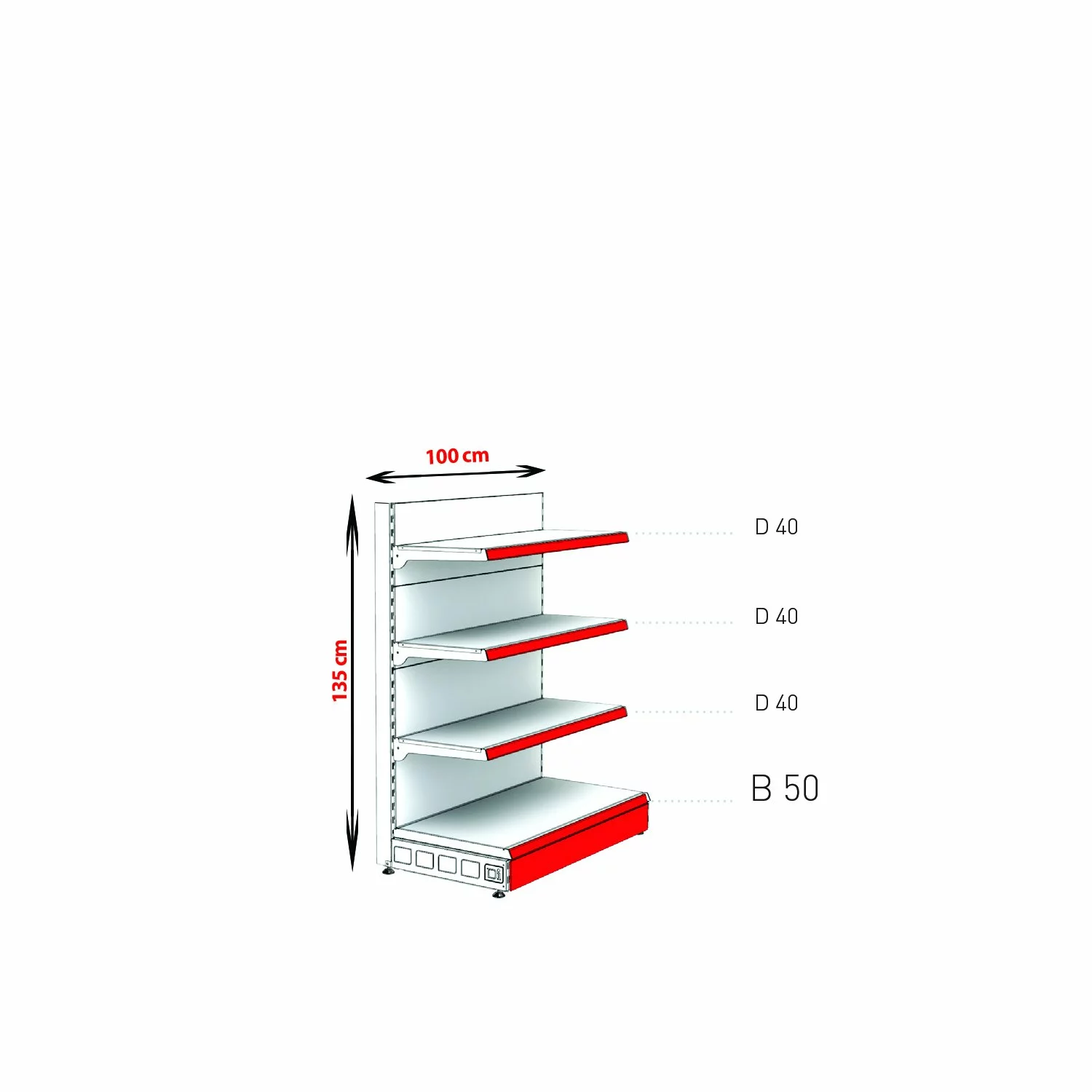 1 x montant, 4 x spate plin, 1 x 50 cm baza, 3 x 40 cm polite cu console si suport etichete, 1 x masca (Important: Acest raft include 1 montant (2 sunt prezentate în imagine), pentru a permite conectarea mai multor unități. Pentru a finaliza tronsonul de rafturi trebuie să fie cumpărat un montant final) |
