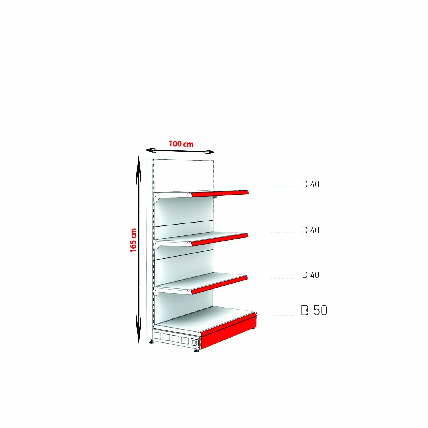 1 x montant, 5 x spate plin, 1 x 50 cm baza, 3 x 40 cm polite cu console si suport etichete, 1 x masca (Important: Acest raft include 1 montant (2 sunt prezentate în imagine), pentru a permite conectarea mai multor unități. Pentru a finaliza tronsonul de rafturi trebuie să fie cumpărat inca un picior montant final) |