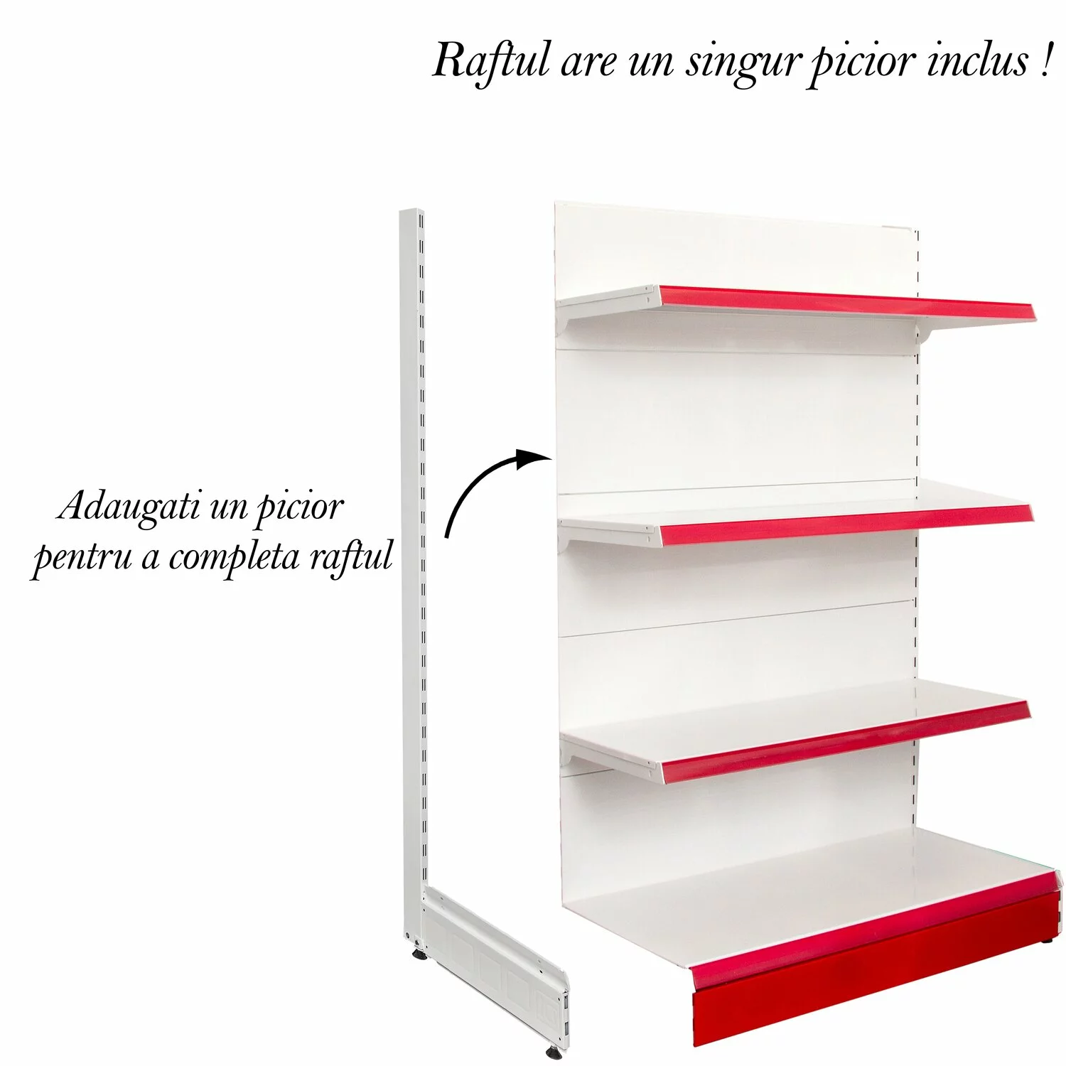 Pretul raftului se calculeaza cu un singur stalp vertical deoarece al doilea stalp vine de la urmatorul raft si se leaga intre ele. Acest lucru va scuteste de a cumpara cate doua profile pe raft. La final dupa ce aveti mai multe module adaugati un picior